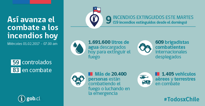 1.405 vehículos aéreos y terrestres están desplegados en combate. La cifra resume las aeronaves desplegadas por Conaf (42), maquinaria pesada (250), carros de bomberos (300), vehículos militares (390), vehículos de Carabineros –incluidos carros lanza aguas– (292) y vehículos de la PDI (131).